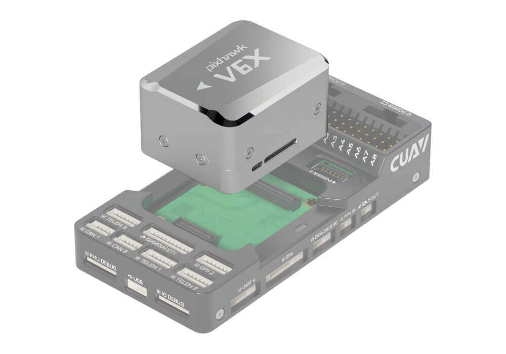 Pixhawk V6X® is a new generation of Pixhawk® designed by CUAV and PX4. It is based on the Pixhawk FMU V6X standard design and pursues the ultimate safety and stability. It features an H7 double-precision floating-point unit and a Cortex-M3 coprocessor, an independent bus and power supply, a triple-redundant IMU, IMU temperature factory pre-calibration technology, and a dual-redundant barometer design, ensuring the safe operation of unmanned system equipment and offering rich expansion capabilities. It integrates a 100M Ethernet PHY and can communicate with mission computers (onboard computers), high-end mapping cameras, and other airborne equipment at high speed to meet the needs of high-end unmanned system equipment.