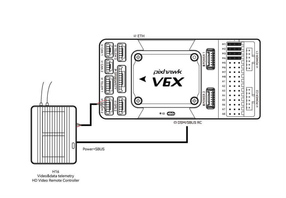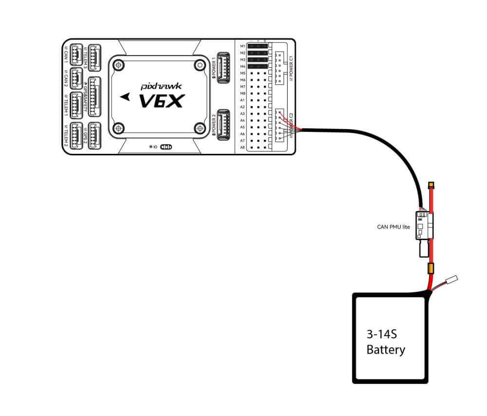 Pixhawk V6X® is equipped with a CAN PMU lite module, which supports a 3~14s lithium battery. Please connect the 6-pin connector of the module to the flight control Power C1 、Power C2 interface