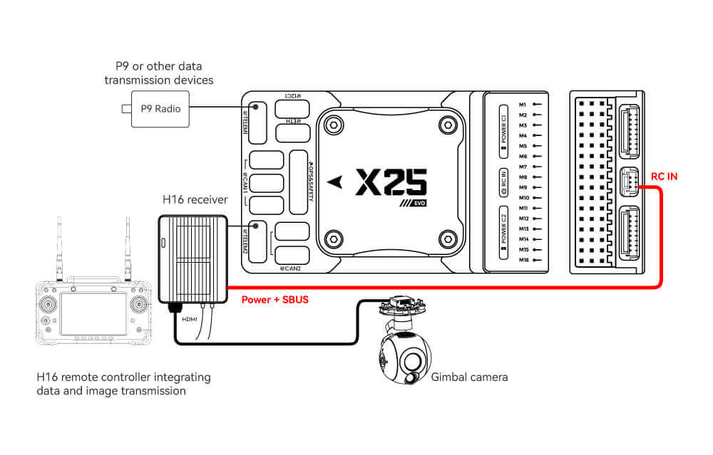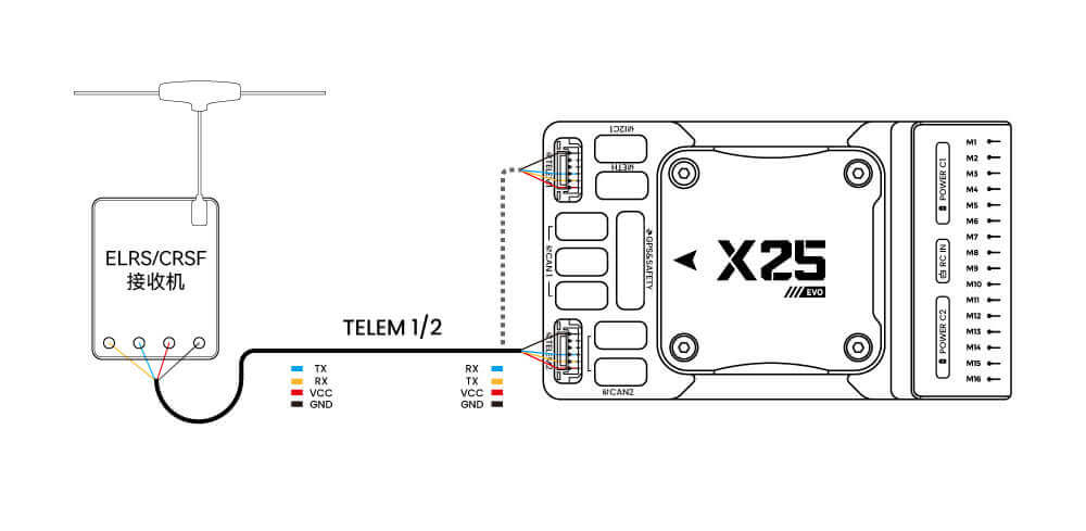 - Connect TELEM1/TELEM2 to the UART0 port of the H16 remote controller, and link the H16’s SBUS pin to the RC IN port.