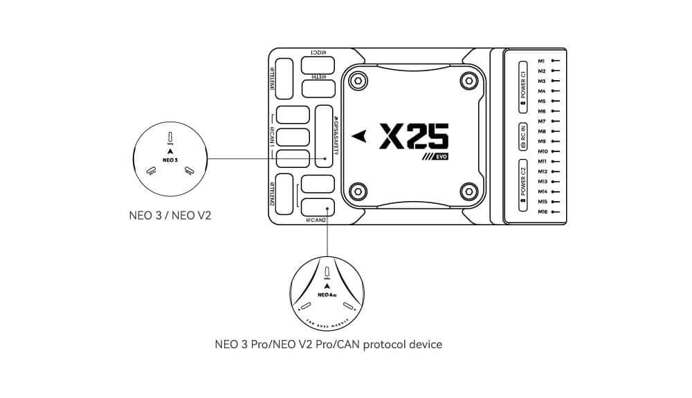 We recommend using a CAN GPS/RTK (such as Neo 4SE); simply connect it to the CAN 1 or CAN 2 port. You can also use a standard GPS/RTK module by connecting it to the GPS&SAFETY port. Most commonly used GPS modules today integrate GPS, compass, safety switch, buzzer, and LED status light. Mount the GPS module on a bracket, keep it away from other electronic devices, and align it with the aircraft’s forward direction (the arrow on the NEO GPS should match the arrow on the flight controller).